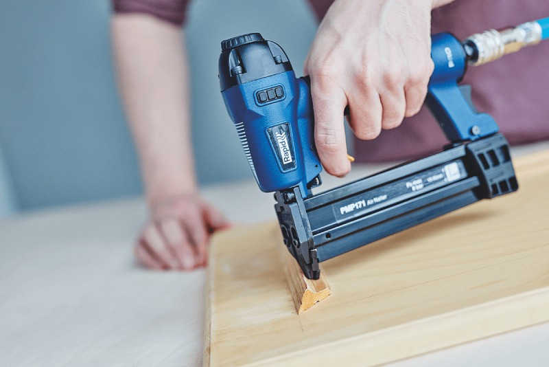 - Строительный степлер – используется для крепления вагонки, деревянных панелей, наличников и другой отделки. Подходит для сборки каркасов и легких деревянных конструкций.