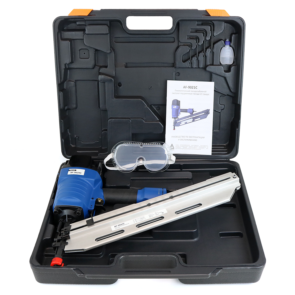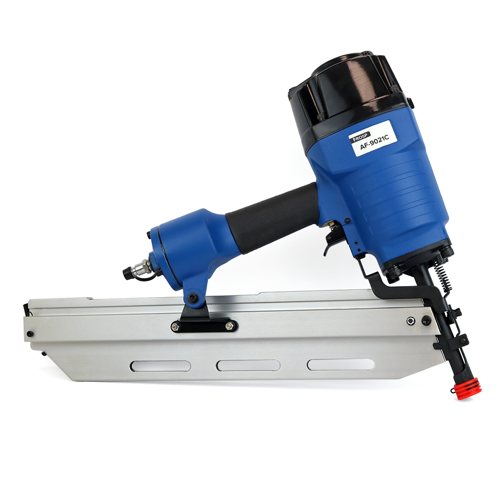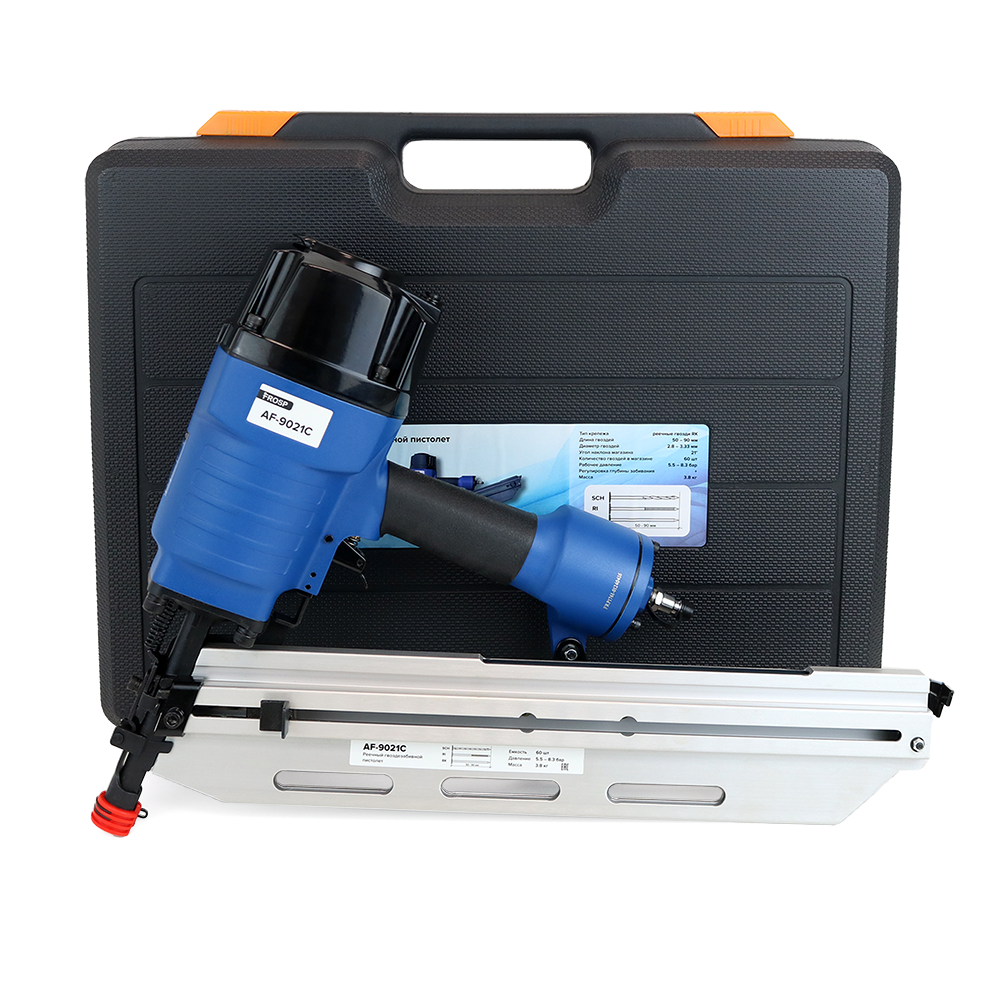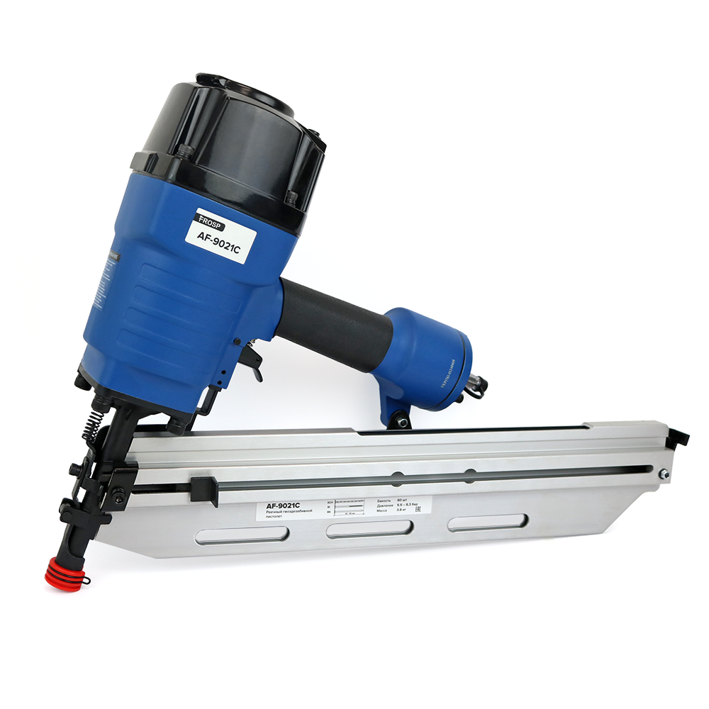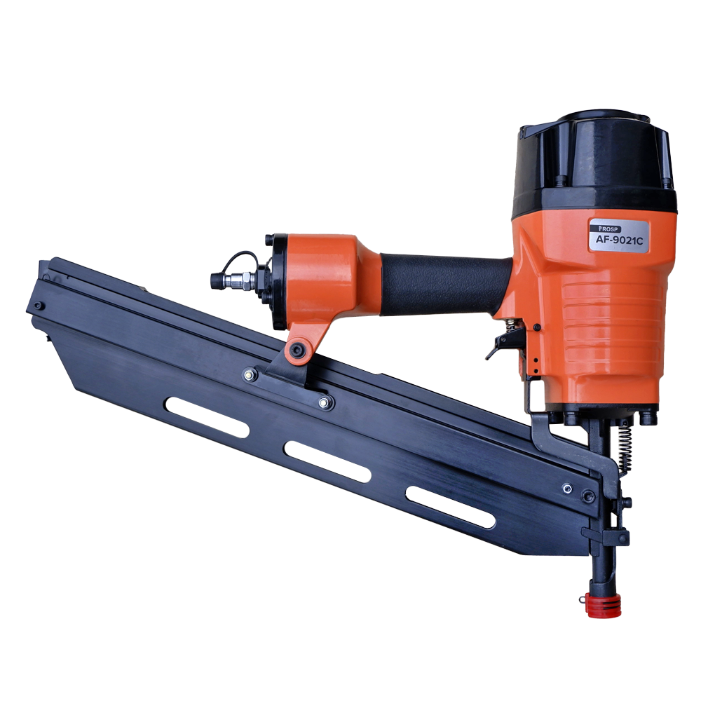 Пневматический нейлер FROSP AF-9021C – гвоздезабивной пневмоинструмент для стройки, ремонта и монтажа. Использует реечные гвозди. Нейлер работает с гвоздями на кассете с углом наклона 21 градус.