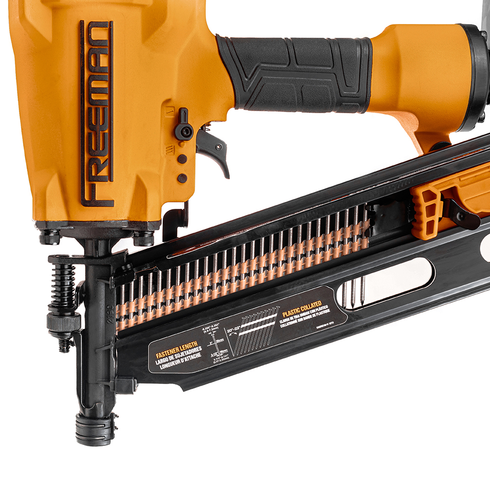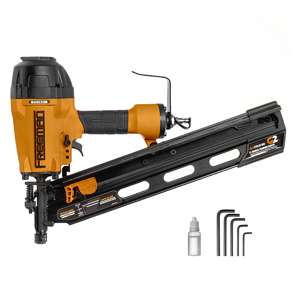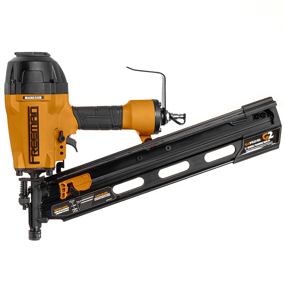 Freeman FM2190 – реечный пневмопистолет для забивания гвоздей в дерево, фанеру, ДСП и прочие материалы. Используется в строительных работах для монтажа отделки, настила чернового пола, сборки конструкций из досок и т.д. Freeman FM2190 подключается к воздушному компрессору с максимальным давлением от 5 бар и производительностью от 100 л/мин.