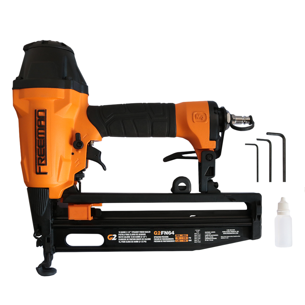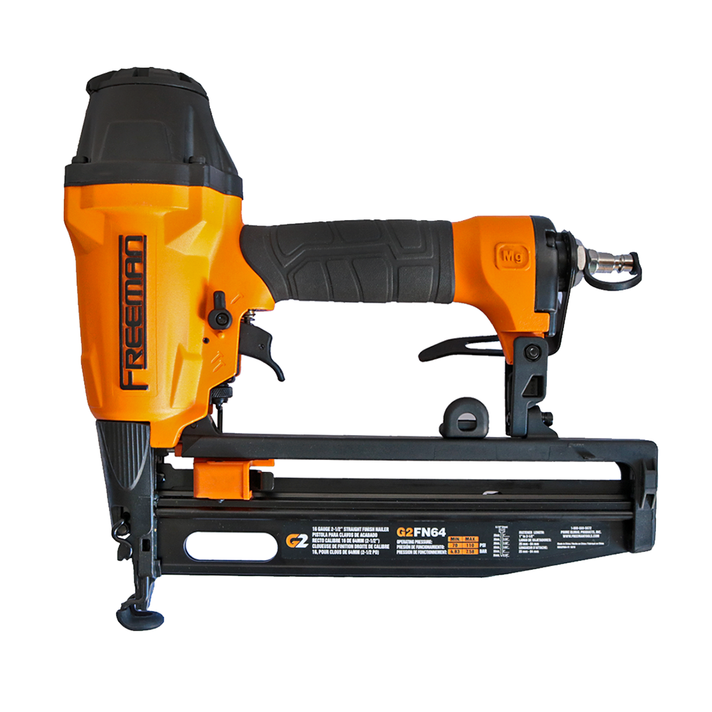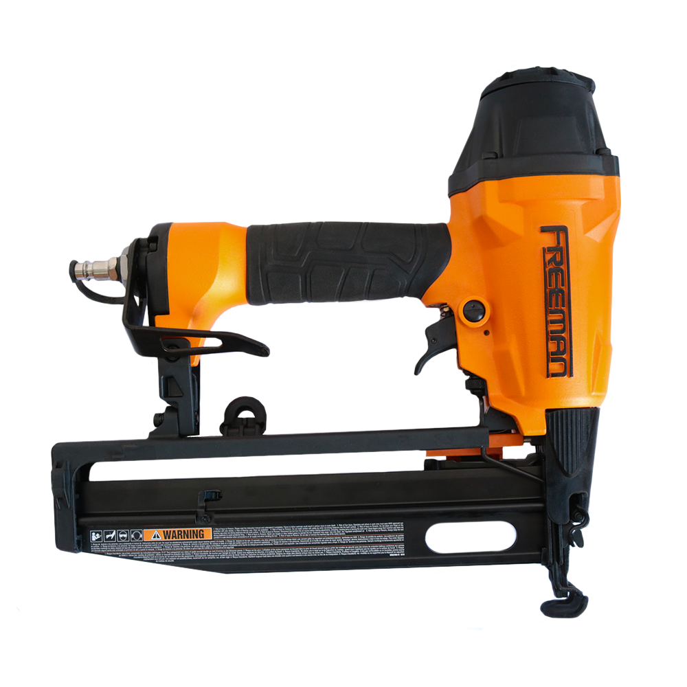 Freeman FM64 – реечный нейлер для гвоздей. Применяется для монтажа отделки, сборки мебели, окон и дверей. Инструмент одним ударом забивает гвоздь в дерево, фанеру, ПВХ, ДСП и другие материалы. Freeman FM64 работает от воздушного компрессора. Вам понадобится агрегат с максимальным давлением от 5 бар и производительностью от 100 л/мин.