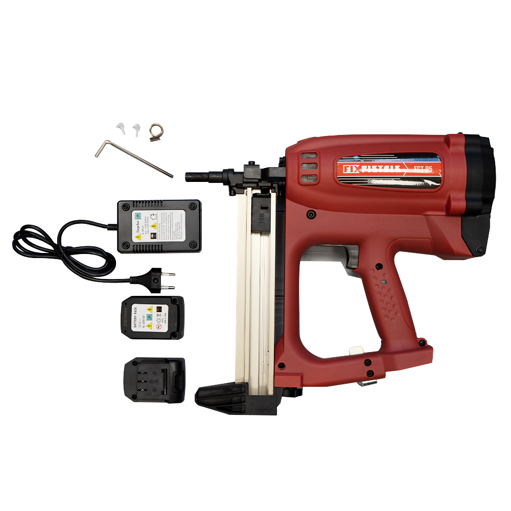 Fixpistols FGT-95 – газовый монтажный пистолет, забивающий дюбель-гвоздь в стену одним ударом. Предварительное сверление не требуется. Для работы с инструментом понадобится баллончик с газом и аккумулятор. Сфера применения: крепление изоляции и утеплителя укладка теплого пола создание крепления для натяжного потолка монтаж подвесов монтаж клипсы крепление профнастила монтаж стальных полос фиксация кабеля крепление штукатурной сетки Преимущества: Силы удара достаточно для работы с бетоном, кирпичом и даже металлом. Облегченная конструкция позволяет долго держать инструмент на весу. Одного баллончика хватает на 1000 выстрелов. Работает практически при любых температурах. Имеет специальную насадку для электромонтажа. Смазывается прямо во время работы лубрикантами, которые подаются вместе с газом.