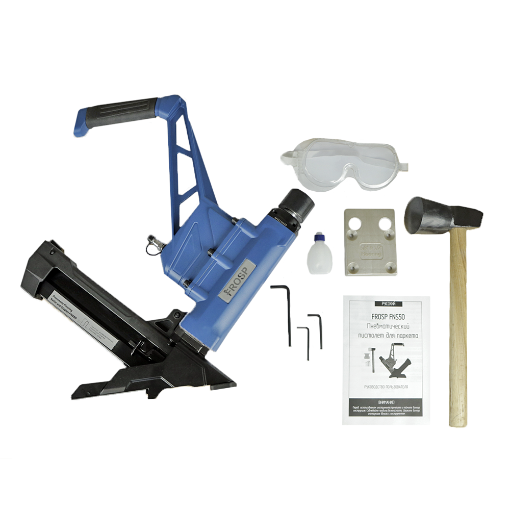 Пистолет пневматический для паркета FROSP FNS50 предназначен для укладки паркетной доски, ламината и других напольных покрытий.
